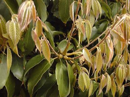 | 展葉時の葉は主脈で2つ折りになっていて托葉がまだ残る。 冬芽の写真のように頂生側芽が多いので、春の芽吹きでは複数の芽が四方八方に伸び始める。 |