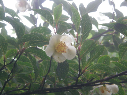 | 一見して分かる通り、ツバキの仲間。ヒメシャラより大きく、ナツツバキより少し小さいサイズ(4cm前後)。 7月ころ、枝の先の葉腋に、白い花をつける。花弁は5枚で、縁には鋸歯があり、外側に絹毛を密生する。 |