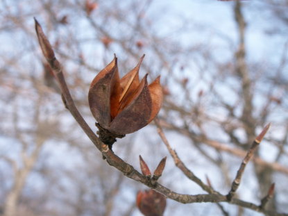 | 冬芽は長楕円形で平たく、先がとがった2枚の芽鱗が見える。 | 冬芽 丹沢 堂平 060413 |