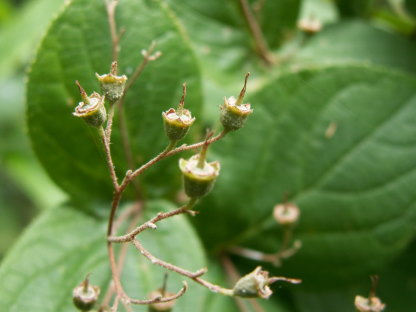 | 実は刮ハで、このウツギの仲間に共通した形になる。花柱が残り、まるでローソク立てのような形だ。秋には丸く太り、茶色に熟すと3〜4裂して種子を出す。 |