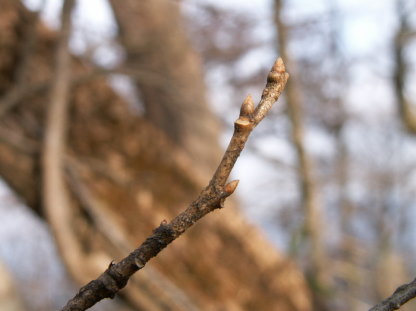 | 1年枝は細く、褐色〜灰褐色で無毛。枝の先端が枯れて折れるため、頂芽の横に、枝の痕(枝痕)がある。 冬芽はやや開出(枝から開いて出る)し、卵形で先が尖る。 |