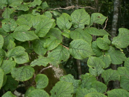 | 葉は互生、葉身は広倒卵形または倒卵形で紙質。先端は尾状に尖る。縁は鋭くてやや荒い鋸歯がある。 | 葉 丹沢 神ノ川060903 |