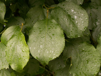 | 葉は互生し、葉身は倒卵形〜楕円形。縁には不整の鈍鋸歯がある。表面は濃緑色で無毛、裏面は淡緑色で、脈腋に微毛がある。 | 葉 横浜市 港北区 060519 |