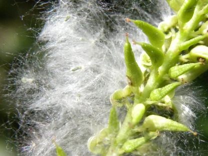 | 熟すと個々の刮ハが2裂し、綿毛をまとった種子を出す。果序は写真のように綿毛に覆われる。写真左の白い綿毛の中に1.5mmほどの線状長楕円形の種子がある。風で遠くまで飛ばされる。 | 種子 秋田県 鳥海山 100626 |