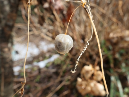 写真は右方向に巻き蔓、下方向に果柄と左下に花殻が落ちた花柄、下から左に新しい蔓が分岐している。