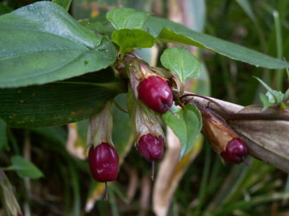 実は液果で紅紫色に熟す。花後、果柄が伸びて残存する花冠より果実が突き出る。液果の先には花柱が残る。