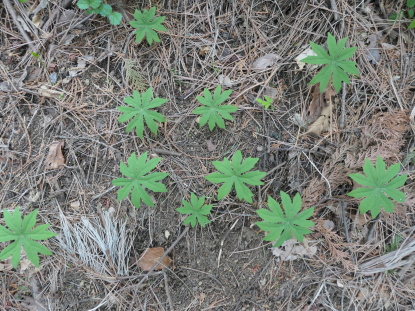 根生葉、茎葉ともに葉身は円形で、7〜9の裂片に掌状深裂する。